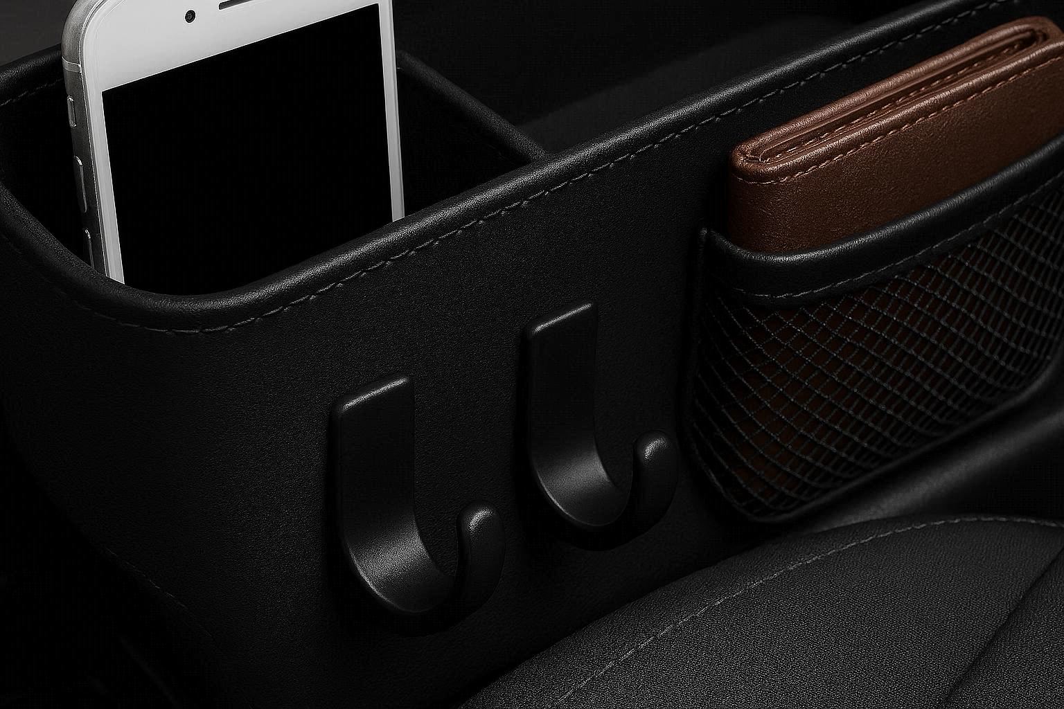 The hooks are integrated into the side panel, providing external hanging options without taking up interior pocket space. The unit stays securely in place due to its custom fit design and non slip backing, preventing it from sliding during acceleration or turns. It effectively reclaims wasted space and turns it into valuable, organized storage.